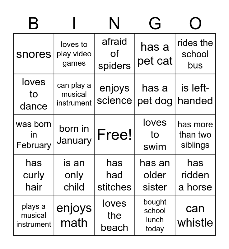 This bingo card has a free space and 30 words: enjoys math, likes spicy food, born in January, packed lunch today, snores, afraid of spiders, can play a musical instrument, has had stitches, loves to swim, loves the beach, has more than two siblings, can whistle, bought school lunch today, has a younger brother, is left-handed, was born in June, has an older sister, has curly hair, is an only child, rides the school bus, was born in February, never been on an airplane, loves to play video games, has a pet dog, loves to dance, has a pet cat, has ridden a horse, plays a musical instrument, enjoys science and loves to sing.