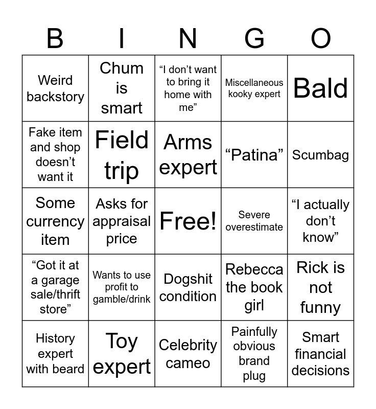 This bingo card has a free space and 24 words: Wants to use profit to gamble/drink, Toy expert, Arms expert, History expert with beard, Bald, Weird backstory, Fake item and shop doesn’t want it, Chum is smart, Severe overestimate, Dogshit condition, “Patina”, Some currency item, Rebecca the book girl, Rick is not funny, Field trip, Painfully obvious brand plug, “I actually don’t know”, “I don’t want to bring it home with me”, Scumbag, Asks for appraisal price, Smart financial decisions, “Got it at a garage sale/thrift store”, Miscellaneous kooky expert and Celebrity cameo.