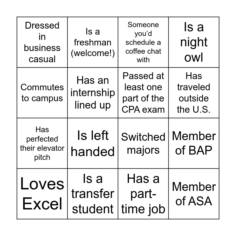 This bingo card has 32 words: Interned at Big 4, Can speak more than 1 language, Member of BAP, Has a LinkedIn profile, Member of ASA, Passed at least one part of the CPA exam, Commutes to campus, First-generation student, Is a freshman (welcome!), Shares your birthday month, Has traveled outside the U.S., Someone you’d schedule a coffee chat with, Taken intermediate accounting, Has studied abroad, Is a transfer student, Favorite food is pizza, Is double majoring or has a minor, Switched majors, Is in the master’s program, Attended a Beach Cleanup, Member of NABA, Has 500+ connections on LinkedIn, Has a part-time job, Taking a night class, Loves Excel, Is a night owl, Has perfected their elevator pitch, Has an internship lined up, Dressed in business casual, Majoring in business, Loves studying on campus and Is left handed.