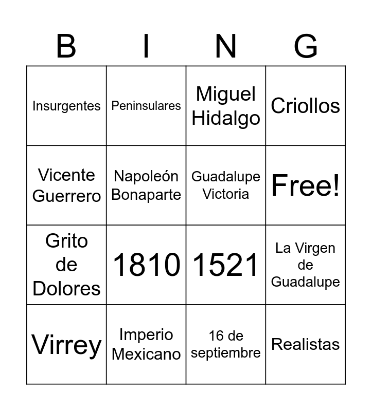 This bingo card has 18 words: 1810, Realistas, Miguel Hidalgo, Insurgentes, 1521, Criollos, Virrey, Peninsulares, Free!, Grito de Dolores, 16 de septiembre, Vicente Guerrero, La Virgen de Guadalupe, Napoleón Bonaparte, Guadalupe Victoria, 1821, Imperio Mexicano and Fusilados.