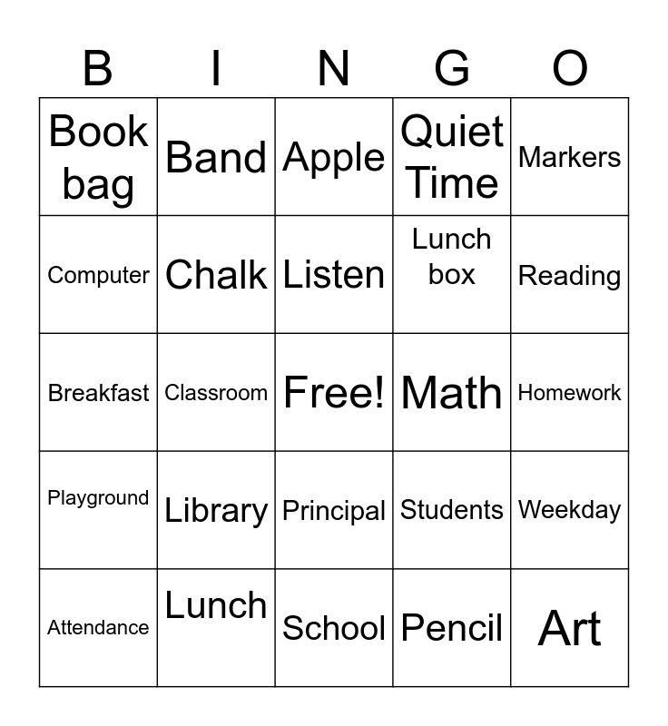 This bingo card has a free space and 34 words: Gym, Pencil, Eraser, Bus Stop, Playground, Chalk, Markers, Attendance, Band, Desk, Listen, Apple, Peer Pressure, Science, Math, Reading, Lunch, Breakfast, Library, Students, Principal, Cafeteria, Book bag, Homework, School, Art, Quiet Time, Test, Lunch box, Computer, Supplies, Classroom, Weekday and Vocabulary.