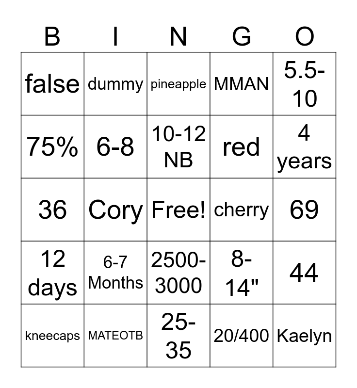 This bingo card has a free space and 28 words: 44, 300, red, 20/400, 75%, pineapple, dummy, 12 days, cherry, kneecaps, 36, MMAN, MATEOTB, 25-35, 4 years, AT LEAST 2 years (WHO), 6-7 Months, 6-8, 10-12 NB, 2500-3000, false, true, Kaelyn, Cory, 69, 8-14", 5.5-10 and scent.