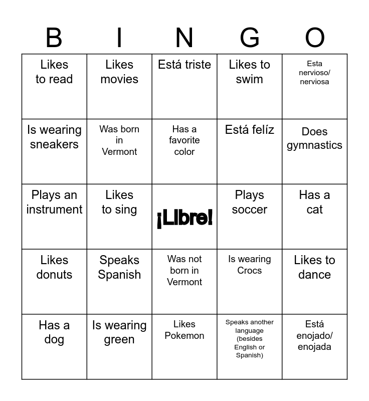 This bingo card has a free space and 24 words: Speaks Spanish, Is wearing green, Has a favorite color, Has a dog, Esta nervioso/ nerviosa, Likes to read, Is wearing sneakers, Likes movies, Plays soccer, Was not born in Vermont, Está felíz, Plays an instrument, Is wearing Crocs, Likes to dance, Was born in Vermont, Speaks another language (besides English or Spanish), Has a cat, Está triste, Does gymnastics, Likes to sing, Está enojado/ enojada, Likes donuts, Likes to swim and Likes Pokemon.