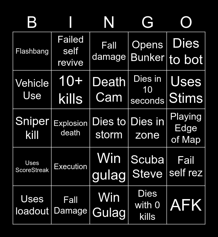 This bingo card has 46 words: Win game, Execution, Bush camping, Omni movment, Playing Edge of Map, TTV (Etc), Failed self revive, Use smokes, Opens Bunker, AFK, Flashbang, 10+ kills, Win gulag, Dies with 0 kills, Uses killstreak, Uses loadout, Explosion death, Dies to storm, Dies to HDR, Dies to bot, Sniper kill, Specialist, Fall damage, Dies in 10 seconds, Dies to Killstreak, Vehicle Use, Riot shield kill, Dolphin Dive, Scuba Steve, Uses Stims, 10+ Kills, Dies with 0 kills, Sniper kill, Throwing knife kill, Dies in 10 Seconds, Uses ScoreStreak, Fall Damage, Win Gulag, Explosion Kill, Fail self rez, Win Game, Death Cam, Dies in zone, TTV (etc), Roof Camping and Use Loadout.