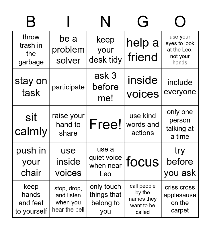 This bingo card has a free space and 29 words: keep hands and feet to yourself, walking feet only, raise your hand to share, wait to be called on before sharing, throw trash in the garbage, keep your desk tidy, participate, use inside voices, use kind words and actions, stop, drop, and listen when you hear the bell, only one person talking at a time, criss cross applesause on the carpet, only touch things that belong to you, call people by the names they want to be called, include everyone, apologize if needed, use a quiet voice when near Leo, push in your chair, use your eyes to look at the Leo, not your hands, sit calmly, focus, use your time wisely, inside voices, stay on task, help a friend, be a problem solver, try before you ask, ask 3 before me! and line up quietly.