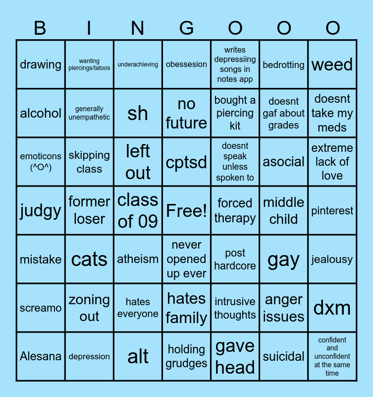 This bingo card has a free space and 48 words: intrusive thoughts, doesnt gaf about grades, holding grudges, former loser, left out, pinterest, wanting piercings/tatoos, depression, bedrotting, never opened up ever, weed, obessesion, asocial, doesnt speak unless spoken to, screamo, middle child, alcohol, doesnt take my meds, anger issues, writes depressiing songs in notes app, bought a piercing kit, class of 09, drawing, generally unempathetic, dxm, sh, extreme lack of love, Alesana, cptsd, skipping class, suicidal, forced therapy, jealousy, zoning out, judgy, post hardcore, gay, emoticons (^O^), atheism, hates everyone, mistake, confident and unconfident at the same time, underachieving, alt, no future, hates family, cats and gave head.