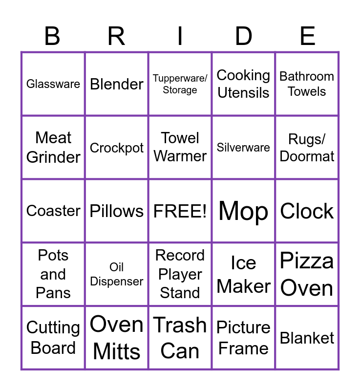 This bingo card has a free space and 49 words: Bed Sheets, Blanket, Laundry Basket, Trash Can, Oil Dispenser, Smoker, Blender, Food Processor, Meat Grinder, Knife Set, Crockpot, Cooking Utensils, Pizza Oven, Ice Maker, Frost Buddy, Vacuum Cleaner, Towel Warmer, Mop, Measuring Spoons/ Cups, Bathroom Towels, Pillows, Picture Frame, Glassware, Silverware, Kitchen Towels, Rugs/ Doormat, Cutting Board, Toaster, Record Player Stand, Pots and Pans, Bath Mats, Cookbook, Plates, Dutch Oven, Oven Mitts, Home Decor, Gift Card, Cookie Scoop, Clock, Ice Cream Scoop, Pressure Washer, Alcohol, KitchenAid Mixer, Candle, Coaster, Tupperware/ Storage, Ring Camera, Money and Cooler.