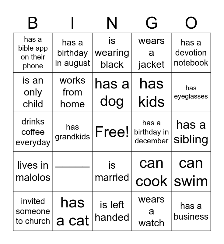 This bingo card has a free space and 25 words: _____, is left handed, has a dog, invited someone to church, has a devotion notebook, has a bible app on their phone, is an only child, has a birthday in august, has a birthday in december, is married, has kids, drinks coffee everyday, can cook, can swim, works from home, can play an instrument, has a sibling, is wearing black, has eyeglasses, has grandkids, has a business, has a cat, lives in malolos, wears a jacket and wears a watch.