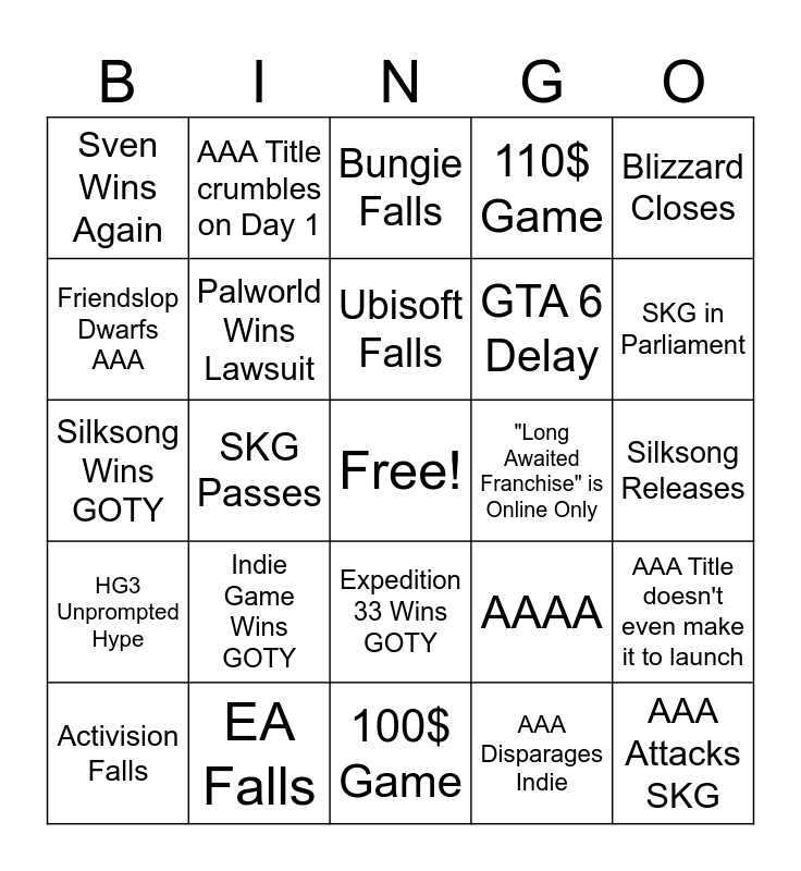 This bingo card has a free space and 24 words: Indie Game Wins GOTY, EA Falls, Ubisoft Falls, Activision Falls, Blizzard Closes, Sven Wins Again, Friendslop Dwarfs AAA, AAA Title crumbles on Day 1, "Long Awaited Franchise" is Online Only, Expedition 33 Wins GOTY, GTA 6 Delay, Silksong Wins GOTY, AAAA, AAA Title doesn't even make it to launch, Palworld Wins Lawsuit, AAA Disparages Indie, Silksong Releases, Bungie Falls, SKG in Parliament, SKG Passes, AAA Attacks SKG, HG3 Unprompted Hype, 110$ Game and 100$ Game.