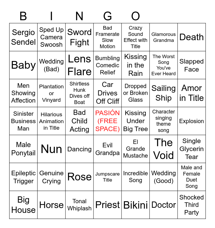 This bingo card has a free space and 48 words: Incredible Song, The Worst Song You've Ever Heard, Priest, Hilarious Animation in Title, Shirtless Hunk Dives off Boat, Explosion, Sped Up Camera Swoosh, Horse, Glamorous Grandma, Evil Grandpa, Death, Bad Framerate Slow Motion, Sailing Ship, Dropped or Broken Glass, Epileptic Trigger, Character singing theme song, Baby, Slapped Face, Wedding (Good), Crazy Sound Effect with Title, Kissing in the Rain, Bad Child Acting, Sergio Sendel, Wedding (Bad), Male and Female Duet Song, Lens Flare, Amor in Title, Big House, Car Drives Off Cliff, Plantation or Vinyard, Doctor, Kissing Under Big Tree, Single Glycerin Tear, Genuine Crying, Sinister Business Man, El Grande Mustache, The Void, Men Showing Affection, Dancing, Rose, Male Ponytail, Shocked Third Party, Sword Fight, Tonal Whiplash, Bumbling Comedic Relief, Jumpscare Title, Nun and Bikini.
