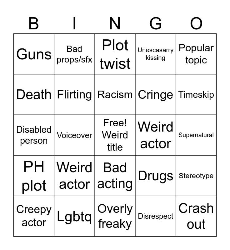 This bingo card has a free space and 24 words: Weird actor, Lgbtq, Racism, Creepy actor, Popular topic, Guns, Death, Bad props/sfx, Weird actor, Bad acting, Cringe, Disabled person, Drugs, Stereotype, Flirting, Disrespect, Supernatural, Plot twist, Timeskip, Voiceover, Crash out, PH plot, Unescasarry kissing and Overly freaky.