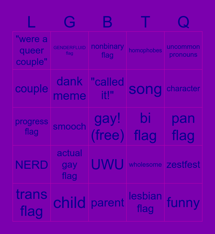 This bingo card has a free space and 24 words: trans flag, actual gay flag, "called it!", lesbian flag, uncommon pronouns, "were a queer couple", GENDERFLUID flag, nonbinary flag, bi flag, pan flag, progress flag, dank meme, wholesome, zestfest, couple, child, parent, homophobes, character, NERD, smooch, UWU, song and funny.