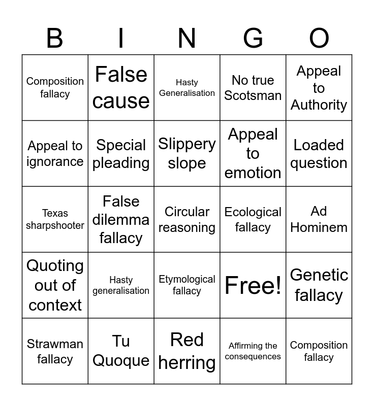 This bingo card has 25 words: Hasty generalisation, Red herring, Slippery slope, Strawman fallacy, Appeal to Authority, Composition fallacy, Appeal to ignorance, False cause, Ecological fallacy, Etymological fallacy, Appeal to emotion, Texas sharpshooter, Free!, Genetic fallacy, Special pleading, Composition fallacy, Ad Hominem, Hasty Generalisation, Loaded question, False dilemma fallacy, Circular reasoning, Tu Quoque, Quoting out of context, No true Scotsman and Affirming the consequences.