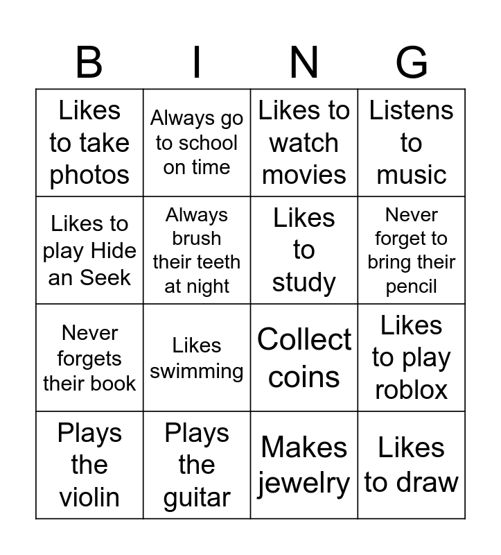 This bingo card has 16 words: Plays the guitar, Likes to play roblox, Likes to watch movies, Likes to take photos, Never forgets their book, Always go to school on time, Collect coins, Makes jewelry, Likes to play Hide an Seek, Always brush their teeth at night, Plays the violin, Listens to music, Likes swimming, Never forget to bring their pencil, Likes to study and Likes to draw.