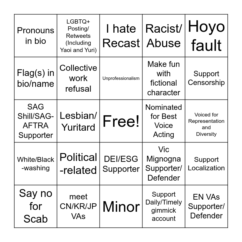 This bingo card has a free space and 24 words: Political -related, meet CN/KR/JP VAs, Unprofessionalism, Say no for Scab, Hoyo fault, Pronouns in bio, Flag(s) in bio/name, LGBTQ+ Posting/ Retweets (Including Yaoi and Yuri), Nominated for Best Voice Acting, DEI/ESG Supporter, Make fun with fictional character, SAG Shill/SAG-AFTRA Supporter, Vic Mignogna Supporter/ Defender, Support Localization, Collective work refusal, Support Daily/Timely gimmick account, Voiced for Representation and Diversity, I hate Recast, Support Censorship, Lesbian/ Yuritard, EN VAs Supporter/ Defender, White/Black -washing, Racist/ Abuse and Minor.