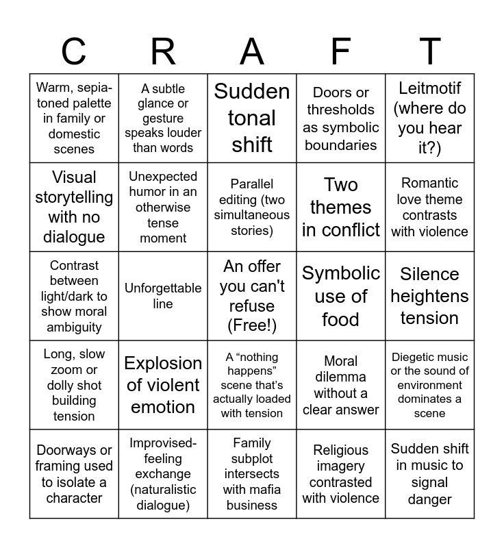 This bingo card has a free space and 24 words: Doorways or framing used to isolate a character, Explosion of violent emotion, Parallel editing (two simultaneous stories), Religious imagery contrasted with violence, Leitmotif (where do you hear it?), Warm, sepia-toned palette in family or domestic scenes, A subtle glance or gesture speaks louder than words, Sudden tonal shift, Symbolic use of food, Silence heightens tension, Contrast between light/dark to show moral ambiguity, Unexpected humor in an otherwise tense moment, Moral dilemma without a clear answer, Diegetic music or the sound of environment dominates a scene, Visual storytelling with no dialogue, Improvised-feeling exchange (naturalistic dialogue), Family subplot intersects with mafia business, Doors or thresholds as symbolic boundaries, Romantic love theme contrasts with violence, Long, slow zoom or dolly shot building tension, Unforgettable line, A “nothing happens” scene that’s actually loaded with tension, Two themes in conflict and Sudden shift in music to signal danger.
