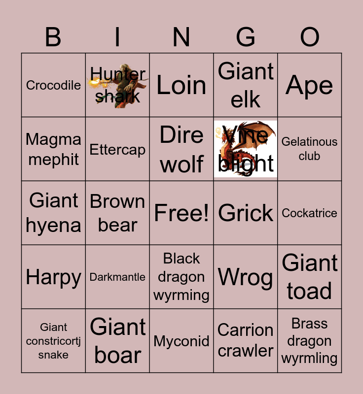 This bingo card has 2 images, a free space and 27 words: Wrog, Ochre jelly, Vine blight, Myconid, Magma mephit, Loin, Hunter shark, Harpy, Grick, Giant toad, Giant hyena, Giant elk, Giant constricortj snake, Giant boar, Gelatinous club, Fire snake, Ettercap, Dire wolf, Darkmantle, Crocodile, Cockatrice, Carrion crawler, Brown bear, Brass dragon wyrmling, Black dragon wyrming, Ape and Ankheg.