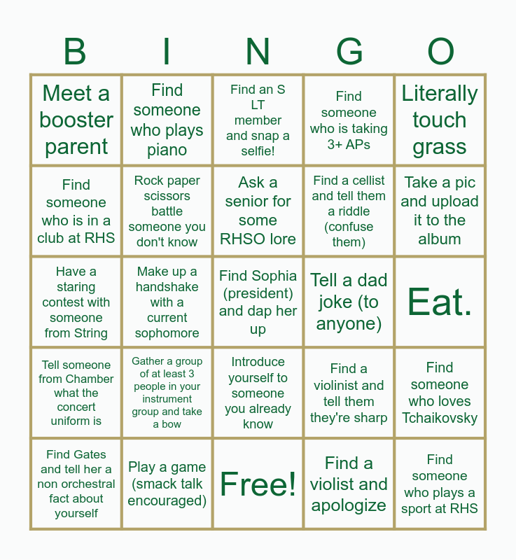This bingo card has 29 words: Find Gates and tell her a non orchestral fact about yourself, Meet a senior and ask them their favorite teacher at RHS (besides Gates), Make up a handshake with a current sophomore, Find someone who plays a sport at RHS, Meet a booster parent, Find an SLT member and snap a selfie!, Rock paper scissors battle someone you don't know, Gather a group of at least 3 people in your instrument group and take a bow, Tell a dad joke (to anyone), Play a game (smack talk encouraged), Eat., Find Sophia (president) and dap her up, Free!, Find a violist and apologize, Take a pic and upload it to the album, Find someone taking AP Gov this year, Introduce yourself to someone you already know, Tell someone from Chamber what the concert uniform is, Literally touch grass, Have a staring contest with someone from String, Find a violinist and tell them they're sharp, Find a bassist and remind them that they are jacked, Find a cellist and tell them a riddle (confuse them), Find someone who is in a club at RHS, Find someone who is taking 3+ APs, Find someone who plays piano, Find someone who loves Tchaikovsky, Ask a senior for some RHSO lore and feel the rain on your skin no one else can feel it for you.