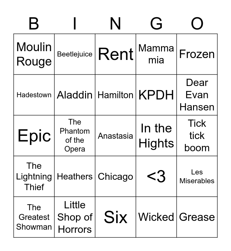 This bingo card has 25 words: Heathers, Six, Hamilton, The Greatest Showman, Frozen, Moulin Rouge, Hadestown, Beetlejuice, In the Hights, Chicago, KPDH, Epic, <3, Les Miserables, Aladdin, Grease, Tick tick boom, Rent, Dear Evan Hansen, The Phantom of the Opera, Anastasia, Little Shop of Horrors, The Lightning Thief, Mamma mia and Wicked.