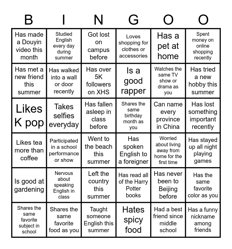 This bingo card has 36 words: Has read all of the Harry Potter books, Left the country this summer, Hates spicy food, Has met a new friend this summer, Likes tea more than coffee, Shares the same birthday month as you, Has walked into a wall or door recently, Taught someone English this summer, Has a pet at home, Has never been to Beijing before, Has tried a new hobby this summer, Loves shopping for clothes or accessories, Has the same favorite color as you, Takes selfies everyday, Is a good rapper, Has made a Douyin video this month, Is good at gardening, Can name every province in China, Likes K pop, Got lost on campus before, Has fallen asleep in class before, Participated in a school performance or show, Has spoken English to a foreigner, Went to the beach this summer, Worried about living away from home for the first time, Studied English every day during summer, Watches the same TV show or drama as you, Shares the same favorite food as you, Has over 5K followers on XHS, Spent money on online shopping recently, Has a funny nickname among friends, Shares the same favorite subject in school, Has stayed up all night playing games, Has lost something important recently, Nervous about speaking English in class and Had a best friend since middle school.