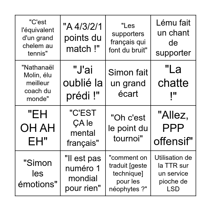 This bingo card has 16 words: "Il est pas numéro 1 mondial pour rien", "Allez, PPP offensif", "Les supporters français qui font du bruit", "C'est l'équivalent d'un grand chelem au tennis", "EH OH AH EH", "A 4/3/2/1 points du match !", "Oh c'est le point du tournoi", "comment on traduit [geste technique] pour les néophytes ?", "Nathanaël Molin, élu meilleur coach du monde", "J'ai oublié la prédi !", "Simon les émotions", Lému fait un chant de supporter, "C'EST ÇA le mental français", "La chatte !", Simon fait un grand écart and Utilisation de la TTR sur un service pioche de LSD.