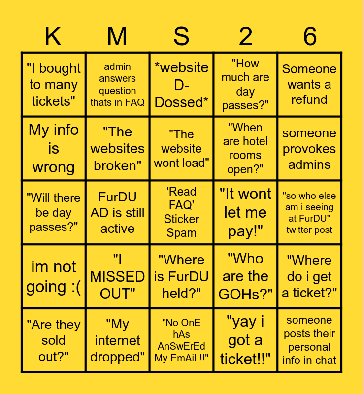 This bingo card has a free space and 24 words: "I MISSED OUT", "My internet dropped", "The website wont load", "Are they sold out?", Someone wants a refund, "I bought to many tickets", My info is wrong, admin answers question thats in FAQ, "It wont let me pay!", "Where is FurDU held?", "When are hotel rooms open?", "Will there be day passes?", "Who are the GOHs?", "Where do i get a ticket?", "The websites broken", "yay i got a ticket!!", "so who else am i seeing at FurDU" twitter post, *website D-Dossed*, someone provokes admins, FurDU AD is still active, someone posts their personal info in chat, im not going :(, "How much are day passes?" and "No OnE hAs AnSwErEd My EmAiL!!".
