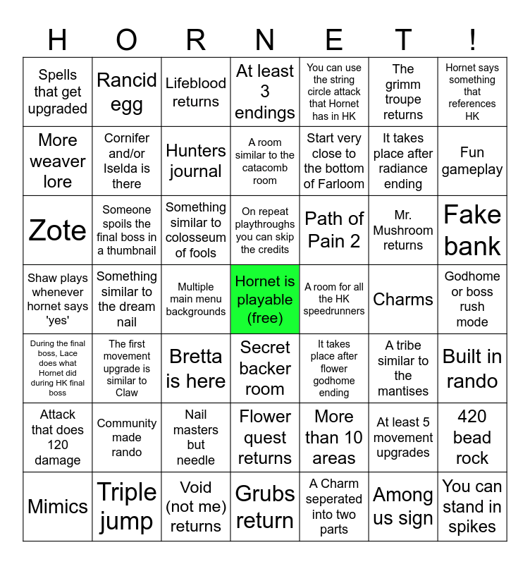 This bingo card has a free space and 48 words: More than 10 areas, It takes place after radiance ending, Grubs return, Something similar to the dream nail, Something similar to colosseum of fools, Godhome or boss rush mode, Rancid egg, Triple jump, The grimm troupe returns, Secret backer room, Hornet says something that references HK, At least 3 endings, Mr. Mushroom returns, Path of Pain 2, Attack that does 120 damage, Charms, More weaver lore, Fun gameplay, At least 5 movement upgrades, You can use the string circle attack that Hornet has in HK, Start very close to the bottom of Farloom, Multiple main menu backgrounds, Spells that get upgraded, Cornifer and/or Iselda is there, 420 bead rock, Hunters journal, Fake bank, Mimics, On repeat playthroughs you can skip the credits, Someone spoils the final boss in a thumbnail, Among us sign, A room for all the HK speedrunners, Built in rando, Community made rando, Shaw plays whenever hornet says 'yes', It takes place after flower godhome ending, A tribe similar to the mantises, Zote, Bretta is here, Nail masters but needle, During the final boss, Lace does what Hornet did during HK final boss, You can stand in spikes, Lifeblood returns, Void (not me) returns, A room similar to the catacomb room, Flower quest returns, The first movement upgrade is similar to Claw and A Charm seperated into two parts.