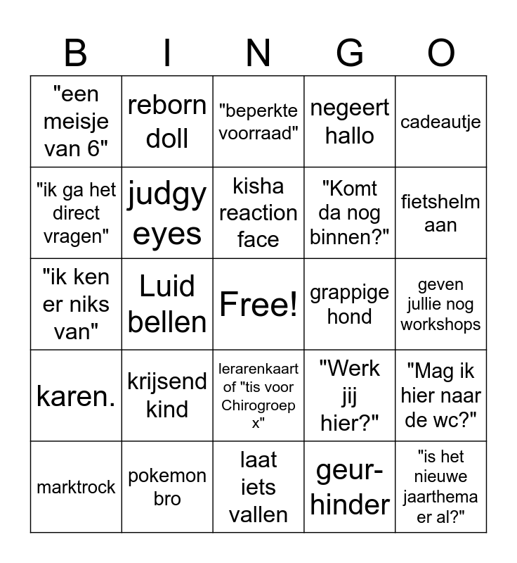 This bingo card has a free space and 24 words: krijsend kind, pokemon bro, kisha reaction face, marktrock, cadeautje, "een meisje van 6", "ik ga het direct vragen", reborn doll, grappige hond, lerarenkaart of "tis voor Chirogroep x", "Komt da nog binnen?", "ik ken er niks van", "Werk jij hier?", "Mag ik hier naar de wc?", judgy eyes, geur-hinder, geven jullie nog workshops, "beperkte voorraad", fietshelm aan, Luid bellen, "is het nieuwe jaarthema er al?", karen., negeert hallo and laat iets vallen.