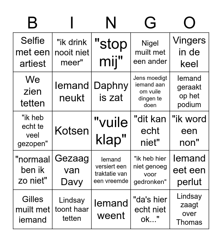This bingo card has a free space and 24 words: Gezaag van Davy, Lindsay toont haar tetten, Daphny is zat, Gilles muilt met iemand, Vingers in de keel, Selfie met een artiest, We zien tetten, "ik drink nooit niet meer", "dit kan echt niet", Iemand versiert een traktatie van een vreemde, Jens moedigt iemand aan om vuile dingen te doen, "ik heb echt te veel gezopen", "ik heb hier niet genoeg voor gedronken", Iemand eet een perlut, Iemand neukt, "da's hier echt niet ok...", "ik word een non", "stop mij", Iemand geraakt op het podium, Kotsen, Lindsay zaagt over Thomas, "normaal ben ik zo niet", Nigel muilt met een ander and Iemand weent.