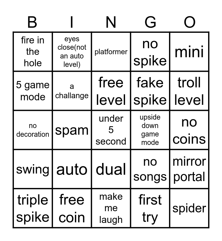 This bingo card has a free space and 24 words: auto, free coin, free level, triple spike, mini, fire in the hole, 5 game mode, eyes close(not an auto level), upside down game mode, dual, fake spike, no decoration, no songs, mirror portal, a challange, first try, no coins, platformer, troll level, spam, spider, swing, no spike and make me laugh.