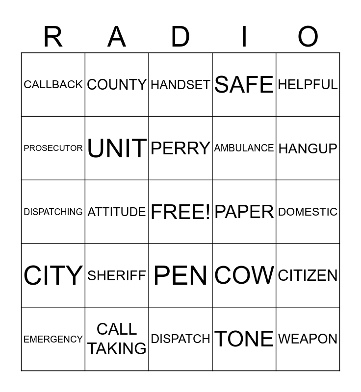 This bingo card has a free space and 37 words: 911, HELP!, COP, UNIT, CITIZEN, SHERIFF, PERRY, DESCRIPTION, HELPFUL, CONTROL, ATTITUDE, SAFE, WEAPON, DOMESTIC, PROSECUTOR, CITY, CONSOLE, HANDSET, PEN, PAPER, CALLBACK, HANGUP, EMERGENCY, DISPATCH, CLEARLY, TONE, COUNTY, LIFELINE, QUESTIONS, CONVERSATION, ACCURACY, CALL TAKING, DISPATCHING, DOG, COW, AMBULANCE and MEDICAL.