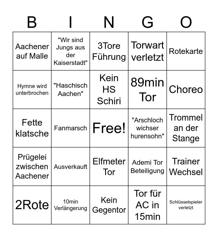This bingo card has a free space and 42 words: Tore öffnen Pünktlich, Kein HS Schiri, (Fast) keine Gäste Fans, Ausverkauft, Tor für AC in 15min, Trainer Wechsel, Schlüsselspieler verletzt, Klassenerhalt, 3Tore Führung, Elfmeter Tor, Trommel an der Stange, Choreo, Fanmarsch, Rotekarte, Gaudino schießt Tor, Ademi Tor Beteiligung, Spielernamen falsch ausgesprochen, Fette klatsche, Aufhol in Nachspielzeit, "Wir sind Jungs aus der Kaiserstadt", Hymne wird unterbrochen, Fangesang Überschneidung, TSV mit Münchener, Aachener auf Malle, Neuer Transfer (bessere Liga), "Ganze Stadion hüpft", 89min Tor, Mittelfeld Platzierung (5-12), Spiel Verschiebung, Kaputte Anzeige, Prügelei, Prügelei zwischen Aachener, "Haschisch Aachen", Kein Gegentor, "Jetzt nicht" Funktioniert, 2Rote, 10min Verlängerung, "Arschloch wichser hurensohn", Alle aus Gruppe sind nüchtern, Keiner hat Kopfschmerzen, Torwart verletzt and Keine gelbe Karte.