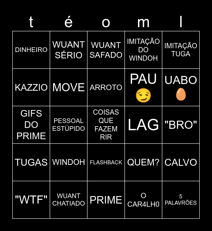 This bingo card has a free space and 24 words: WINDOH, WUANT CHATIADO, ARROTO, "WTF", IMITAÇÃO TUGA, DINHEIRO, KAZZIO, WUANT SÉRIO, LAG, FLASHBACK, PAU😏, GIFS DO PRIME, QUEM?, CALVO, MOVE, O CAR4LH0, "BRO", WUANT SAFADO, UABO🥚, PESSOAL ESTÚPIDO, 5 PALAVRÕES, TUGAS, IMITAÇÃO DO WINDOH and PRIME.