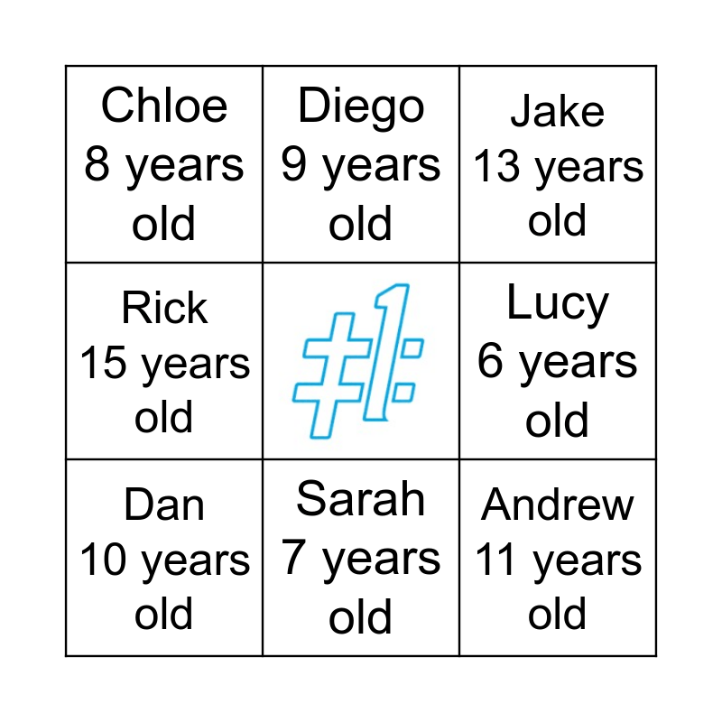 This bingo card has a free space and 16 words: Lucca 11 years old, Emma 10 years old, Jake 13 years old, Chloe 8 years old, Ling 11 years old, Diego 9 years old, Juan 5 years old, Rosa 12 years old, Andrew 11 years old, Lucy 6 years old, Susie 15 years old, Rick 15 years old, Jill 8 years old, Sarah 7 years old, Dan 10 years old and Fred 14 years old.