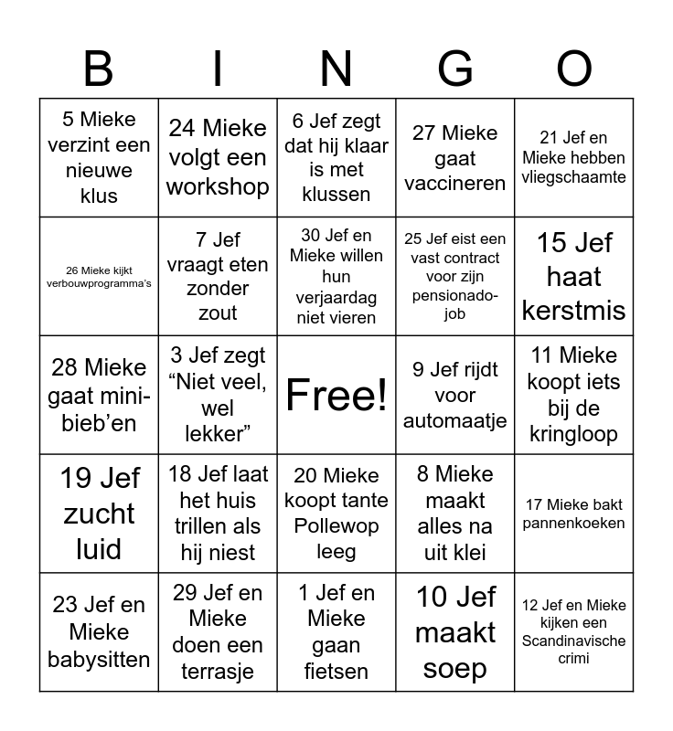 This bingo card has a free space and 31 words: 1 Jef en Mieke gaan fietsen, 2 Jef en Mieke aan bridgen, 3 Jef zegt “Niet veel, wel lekker”, 4 Mieke haalt een nieuwe kat in huis, 5 Mieke verzint een nieuwe klus, 6 Jef zegt dat hij klaar is met klussen, 7 Jef vraagt eten zonder zout, 8 Mieke maakt alles na uit klei, 9 Jef rijdt voor automaatje, 10 Jef maakt soep, 11 Mieke koopt iets bij de kringloop, 12 Jef en Mieke kijken een Scandinavische crimi, 13 Jef maakt een plaatje in aluminium, 14 Jef en Mieke gaan lunchen, 15 Jef haat kerstmis, 16 Mieke koopt nieuwe kerstdecoratie, 17 Mieke bakt pannenkoeken, 18 Jef laat het huis trillen als hij niest, 19 Jef zucht luid, 20 Mieke koopt tante Pollewop leeg, 21 Jef en Mieke hebben vliegschaamte, 22 Jef en Mieke kopen alweer een nieuwe auto, 23 Jef en Mieke babysitten, 24 Mieke volgt een workshop, 25 Jef eist een vast contract voor zijn pensionado-job, 26 Mieke kijkt verbouwprogramma’s, 27 Mieke gaat vaccineren, 28 Mieke gaat mini-bieb’en, 29 Jef en Mieke doen een terrasje, 30 Jef en Mieke willen hun verjaardag niet vieren and 31 Jef smost op zijn kleren.