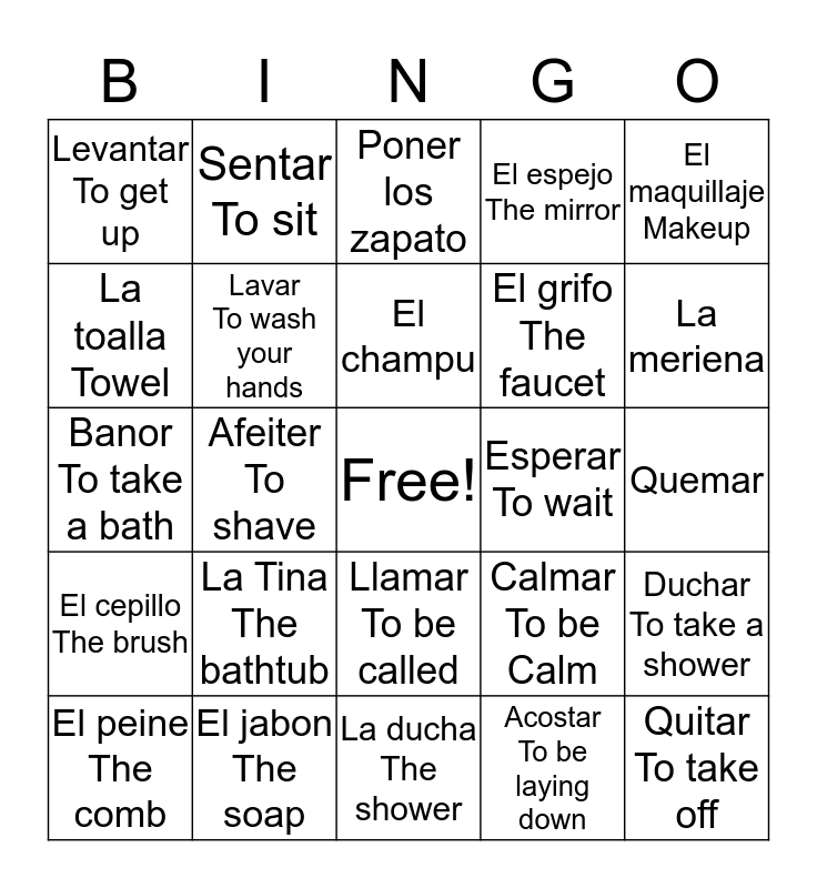 This bingo card has a free space and 24 words: La Tina The bathtub, El jabon The soap, El champu, El peine The comb, El maquillaje Makeup, Levantar To get up, La toalla Towel, Sentar To sit, Esperar To wait, Llamar To be called, El grifo The faucet, Banor To take a bath, Calmar To be Calm, Duchar To take a shower, Lavar To wash your hands, Acostar To be laying down, Quemar, Poner los zapato, La meriena, Afeiter To shave, Quitar To take off, El cepillo The brush, El espejo The mirror and La ducha The shower.