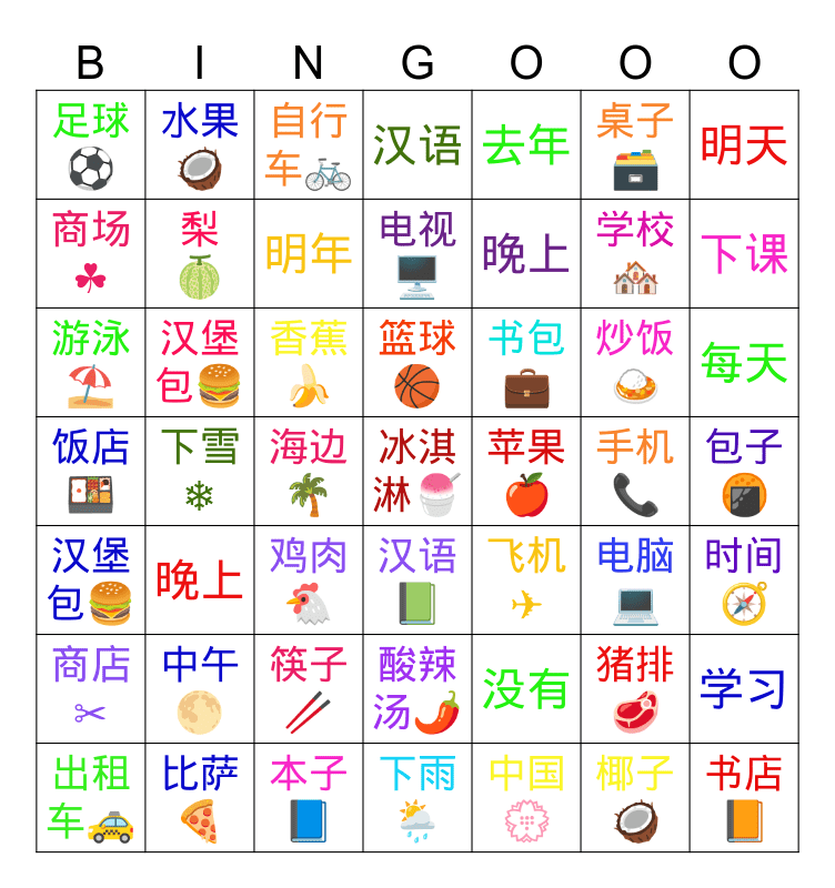 This bingo card has a free space and 48 words: 没有, 学校🏘, 下雨 🌦, 下雪 ❄, 香蕉 🍌, 包子🍘, 水果 🥥, 比萨🍕, 桌子 🗃, 汉语📗, 明天, 汉语, 炒饭🍛, 书包 💼, 商店 ✂, 手机 📞, 商场 ☘, 下课, 猪排 🥩, 去年, 晚上, 海边 🌴, 足球 ⚽, 梨 🍈, 学习, 明年, 每天, 出租车🚕, 篮球 🏀, 汉堡包🍔, 椰子 🥥, 苹果 🍎, 时间 🧭, 中午 🌕, 饭店 🍱, 飞机 ✈, 电脑 💻, 游泳 ⛱, 鸡肉 🐔, 筷子 🥢, 汉堡包🍔, 书店 📙, 自行车🚲, 本子 📘, 电视 🖥, 酸辣汤🌶, 晚上 and 中国💮.