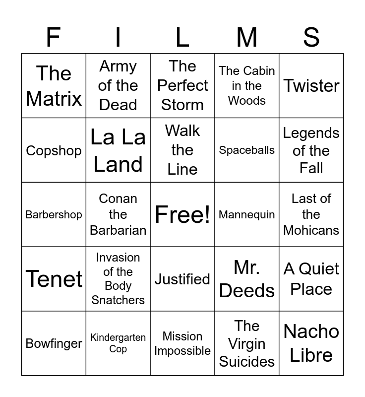This bingo card has a free space and 64 words: This is 40, Halloween H20, If, A Quiet Place, Dirty Rotten Scoundrels, Horrible Bosses, Army of the Dead, 8 Mile, Walk the Line, Lifeforce, Justified, The Postman, Last of the Mohicans, Twister, The Wraith Race, Copshop, Conan the Barbarian, The Matrix, 2 Fast 2 Furious, Spaceballs, Invasion of the Body Snatchers, Tenet, The Cabin in the Woods, Birds of Prey, Commando, Angels & Demons, Die Hard, Antz, The Hunt for Red October, People Like Us, Stargate SG-1, Law Abiding Citizen, After the Wedding, Baby Driver, Legends of the Fall, Bowfinger, The Transporter, The Virgin Suicides, Pacific Rim, La La Land, Barbershop, Mannequin, Shaft, Once upon a Crime, Ghandi, Nacho Libre, Kindergarten Cop, Twins, Mr. Deeds, Flashdance, Skyfall, Dodgeball, Mission Impossible, The Cell, Hook, The Majestic, The Perfect Storm, Stand by Me, Se7en, Office Space, Pulp Fiction, Bruce Almighty, Beetlejuice and Jurassic Park.