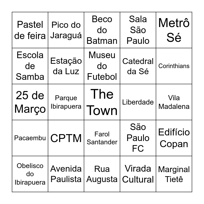 This bingo card has 30 words: Avenida Paulista, MASP, Parque Ibirapuera, Mercadão Municipal, Pastel de feira, Beco do Batman, Estação da Luz, Farol Santander, Liberdade, Rua Augusta, Vila Madalena, The Town, Virada Cultural, Marginal Tietê, Corinthians, Palmeiras, São Paulo FC, Pacaembu, CPTM, Metrô Sé, 25 de Março, Ponte Estaiada, Pico do Jaraguá, Catedral da Sé, Escola de Samba, Sala São Paulo, Edifício Copan, Obelisco do Ibirapuera, Museu do Futebol and Memorial da América Latina.