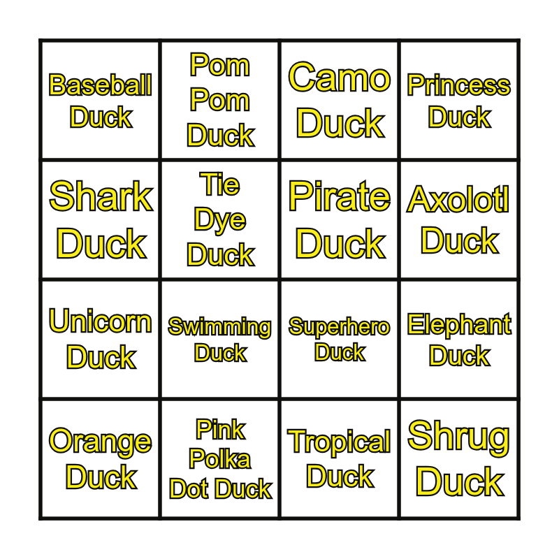 This bingo card has 20 words: Elephant Duck, Capybara Duck, Camo Duck, Cube Duck, Orange Duck, Shark Duck, Pink Polka Dot Duck, Baseball Duck, Unicorn Duck, Pom Pom Duck, Swimming Duck, Superhero Duck, Tie Dye Duck, Shrug Duck, Pirate Duck, Political Duck, Axolotl Duck, Princess Duck, Tropical Duck and Dino Duck.