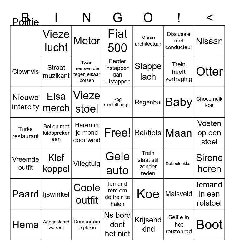 This bingo card has a free space and 48 words: Koe, Trein heeft vertraging, Ns bord doet het niet, Bellen met luidspreker aan, Vieze stoel, Voeten op een stoel, Vieze lucht, Aangestaard worden, Discussie met conducteur, Gele auto, Nissan, Fiat 500, Baby, Regenbui, Paard, Maan, Clownvis, Otter, Maisveld, Mooie architectuur, Slappe lach, Haren in je mond door wind, Politie, Straat muzikant, Iemand in een rolstoel, Twee mensen die tegen elkaar botsen, Chocomelk koe, Hema, Rog sleutelhanger, Elsa merch, Selfie in het reuzenrad, Bakfiets, Sirene horen, Ijswinkel, Turks restaurant, Trein staat stil zonder reden, Dubbeldekker, Nieuwe intercity, Vliegtuig, Coole outfit, Vreemde outfit, Boot, Motor, Deo/parfum explosie, Eerder instappen dan uitstappen, Iemand rent om de trein te halen, Klef koppel and Krijsend kind.