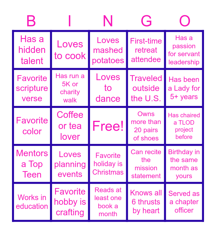 This bingo card has a free space and 30 words: Favorite hobby is crafting, Favorite movie is a classic, Coffee or tea lover, Enjoys singing in the choir, Has a hidden talent, Loves mashed potatoes, Has run a 5K or charity walk, Favorite holiday is Christmas, Owns more than 20 pairs of shoes, Reads at least one book a month, Has chaired a TLOD project before, Served as a chapter officer, Knows all 6 thrusts by heart, Volunteered for NCNW, UNCF, or NAACP project, Has been a Lady for 5+ years, Attended Area Conference or Syn-Lod, Can recite the mission statement, Mentors a Top Teen, Loves planning events, Has a passion for servant leadership, Favorite color, Has more than 2 children, Loves to cook, Traveled outside the U.S., Favorite scripture verse, First-time retreat attendee, Birthday in the same month as yours, Works in education, Loves to dance and Enjoys gardening.