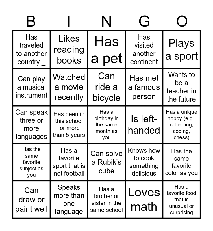 This bingo card has 25 words: Has the same favorite subject as you, Speaks more than one language, Has a birthday in the same month as you, Loves math, Plays a sport, Has traveled to another country _, Likes reading books, Has a pet, Is left-handed, Has the same favorite color as you, Can play a musical instrument, Watched a movie recently, Has a brother or sister in the same school, Knows how to cook something delicious, Wants to be a teacher in the future, Can draw or paint well, Has been in this school for more than 5 years, Can ride a bicycle, Has met a famous person, Has a unique hobby (e.g., collecting, coding, chess), Can speak three or more languages, Has a favorite sport that is not football, Can solve a Rubik’s cube, Has visited another continent and Has a favorite food that is unusual or surprising.