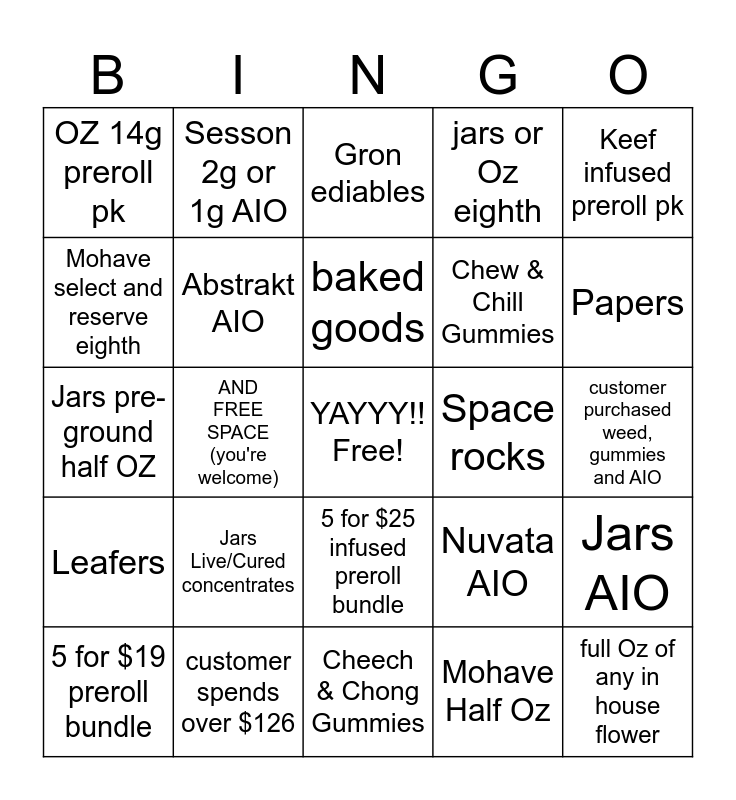 This bingo card has a free space and 24 words: Jars Live/Cured concentrates, customer spends over $126, baked goods, 5 for $19 preroll bundle, Keef infused preroll pk, OZ 14g preroll pk, Mohave select and reserve eighth, Sesson 2g or 1g AIO, Space rocks, 5 for $25 infused preroll bundle, Chew & Chill Gummies, Jars pre-ground half OZ, Nuvata AIO, Jars AIO, Abstrakt AIO, Mohave Half Oz, customer purchased weed, gummies and AIO, Gron ediables, Papers, AND FREE SPACE (you're welcome), full Oz of any in house flower, Leafers, jars or Oz eighth and Cheech & Chong Gummies.