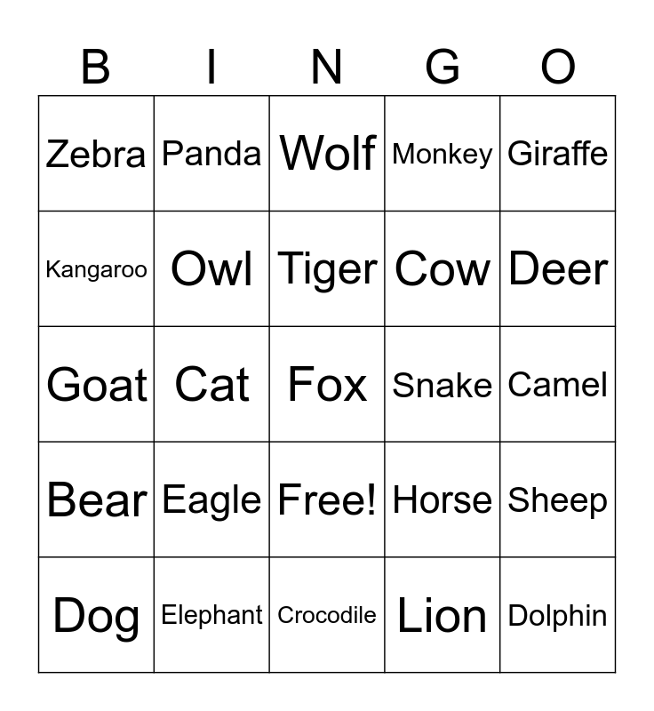 This bingo card has 26 words: Free!, Lion, Tiger, Elephant, Giraffe, Zebra, Kangaroo, Panda, Camel, Horse, Cow, Goat, Sheep, Dog, Cat, Rabbit, Monkey, Bear, Wolf, Fox, Deer, Crocodile, Snake, Eagle, Owl and Dolphin.