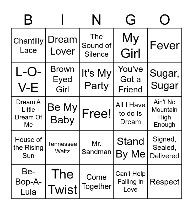 This bingo card has a free space and 24 words: Tennessee Waltz, The Twist, It's My Party, Be-Bop-A-Lula, Fever, Chantilly Lace, L-O-V-E, Dream Lover, All I Have to do Is Dream, Mr. Sandman, You've Got a Friend, Dream A Little Dream Of Me, Stand By Me, Signed, Sealed, Delivered, Brown Eyed Girl, Can't Help Falling in Love, Ain't No Mountain High Enough, The Sound of Silence, Sugar, Sugar, Be My Baby, Respect, House of the Rising Sun, My Girl and Come Together.