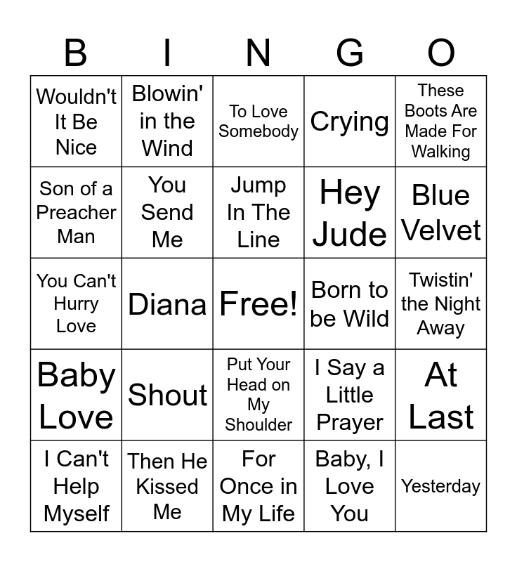 This bingo card has a free space and 24 words: Shout, Then He Kissed Me, Jump In The Line, I Can't Help Myself, These Boots Are Made For Walking, Wouldn't It Be Nice, Son of a Preacher Man, Blowin' in the Wind, Born to be Wild, Put Your Head on My Shoulder, Hey Jude, You Can't Hurry Love, I Say a Little Prayer, At Last, You Send Me, Baby, I Love You, Twistin' the Night Away, To Love Somebody, Blue Velvet, Diana, Yesterday, Baby Love, Crying and For Once in My Life.