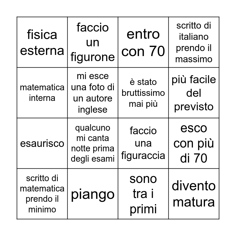 This bingo card has 16 words: piango, esco con più di 70, entro con 70, fisica esterna, esaurisco, faccio un figurone, faccio una figuraccia, sono tra i primi, matematica interna, mi esce una foto di un autore inglese, scritto di matematica prendo il minimo, scritto di italiano prendo il massimo, qualcuno mi canta notte prima degli esami, più facile del previsto, è stato bruttissimo mai più and divento matura.