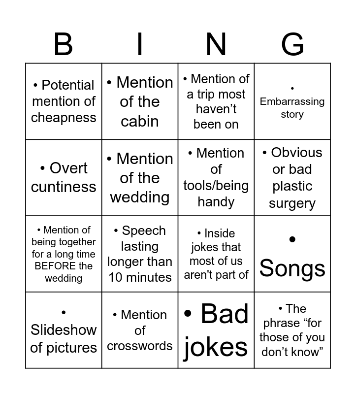 This bingo card has 22 words: • Mention of crosswords, • Mention of golf, • Mention of the cabin, • Mention of the kids, • Mention of the wedding, • Mention of tools/being handy, • Potential mention of cheapness, • Mention of a trip most haven’t been on, • Inside jokes that most of us aren't part of, • The phrase “for those of you don’t know”, • Mention of being together for a long time BEFORE the wedding, • Embarrassing story, • A speaker becoming emotional, • Rambling speech, • Bad jokes, • Genuinely good joke, • Songs, • Slideshow of pictures, • Speech lasting longer than 10 minutes, • Overt cuntiness, • Obvious or bad plastic surgery and • balloon popping mid speech.