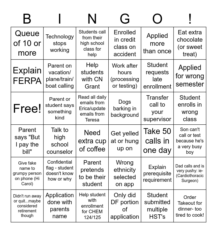 This bingo card has 36 words: Wrong ethnicity selected on app, Parent pretends to be their student, Only did DF portion of application, Explain FERPA, Parent says "But I pay the bill", Dogs barking in background, Parent on vacation/ plane/train/ boat calling, Help student with enrollment for CHEM 124/125, Applied more than once, Explain prerequisite requirement, Applied for wrong semester, Enrolled in credit class on accident, Dad calls and is very pushy: ie- (Cardiothoracic Surgeon), Parent or student says something kind, Work after hours (processing or testing), Queue of 10 or more, Give fake name to grumpy person on phone (Hi Carol), Transfer call to your supervisor, Free!, Students call from their high school class for help, Read all daily emails from Erica/update emails from Teresa, Talk to high school counselor, Get yelled at or hung up on, Need extra cup of coffee, Take 50 calls in one day, Technology stops working, Student requests late enrollment, Application done with parents name, Help students with CN Grant, Eat extra chocolate (or sweet treat), Order Takeout for dinner- too tired to cook!, Didn't run away or quit...maybe considered retirement though, Son can't call or test because he's a very busy boy, Student enrolls in wrong class, Confidential flag - student doesn't know how or why and Student submitted multiple HST's.